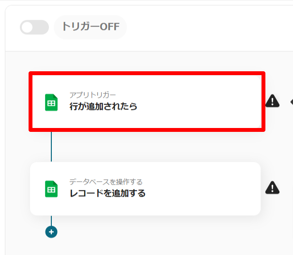 トリガーとはアプリ上でフローを動かすきっかけになるアクションのことを指し、ここでは「Google スプレッドシートの行が更新されたら」を指します。
