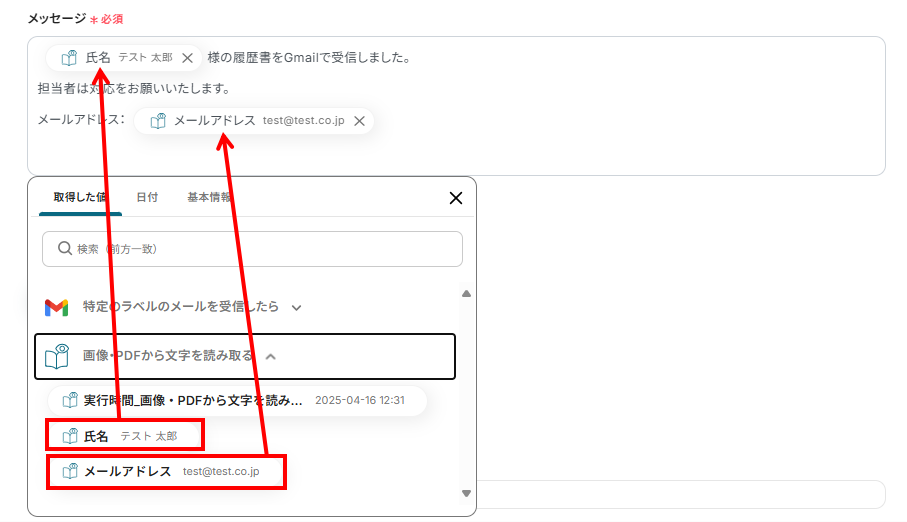 例えば、フォームやメールで受信したファイルをOCRで読み取り、通知したり転記したりできます。
