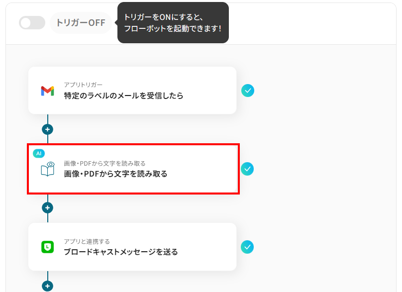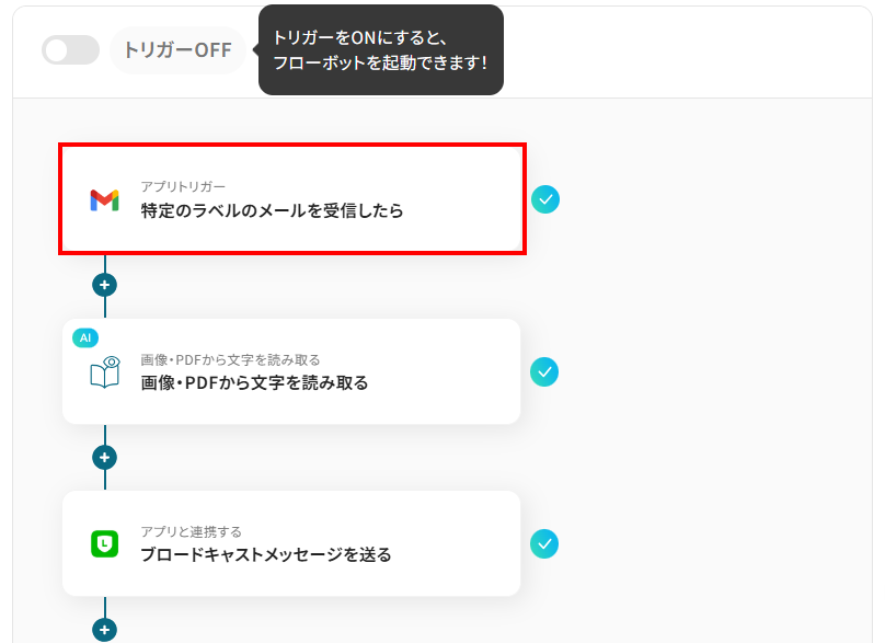ここでは、例として「Gmailで受信した画像ファイルをOCRで読み取り、抽出したテキストをLINE公式アカウントのブロードキャストメッセージとして送信する」自動化フローの作成手順を解説します。