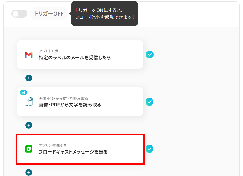 例えば、Gmailに添付された請求書や報告書の画像を自動的にOCR技術でテキスト化し、その内容をLINEのブロードキャスト機能を使ってチーム全体に共有することが可能です。