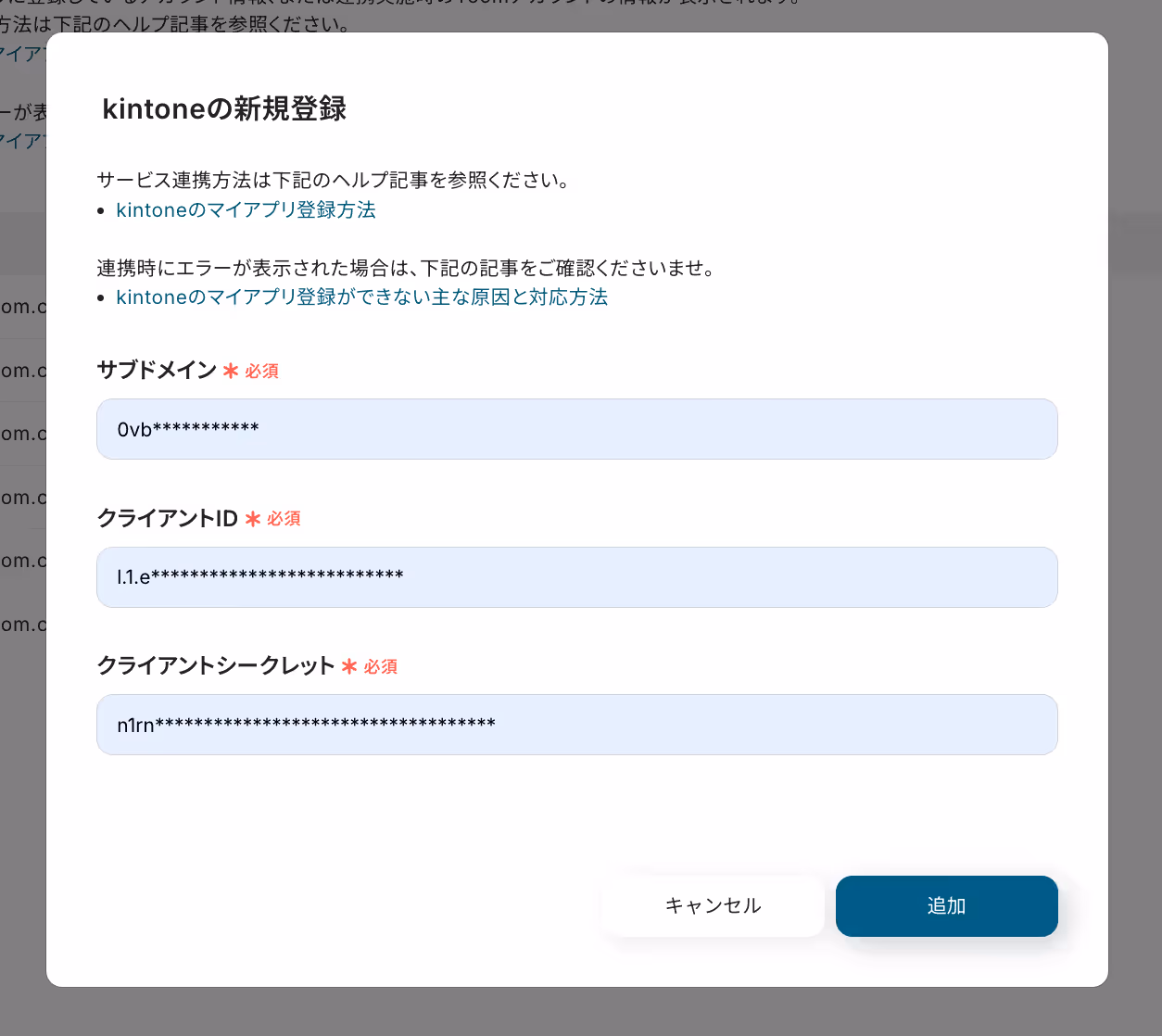 ジョブカン経費精算・ワークフローを選択できたら、使用するアカウントと事前に取得したアクセストークンを入力して「追加」してください。