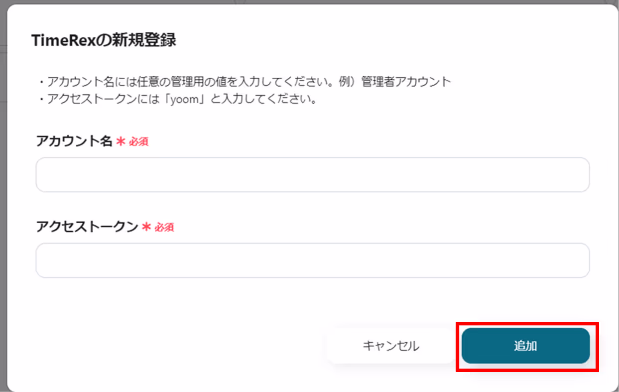 以下の内容がでてくるので、アクセス名とアクセストークンを入力し、「追加」をクリックします。