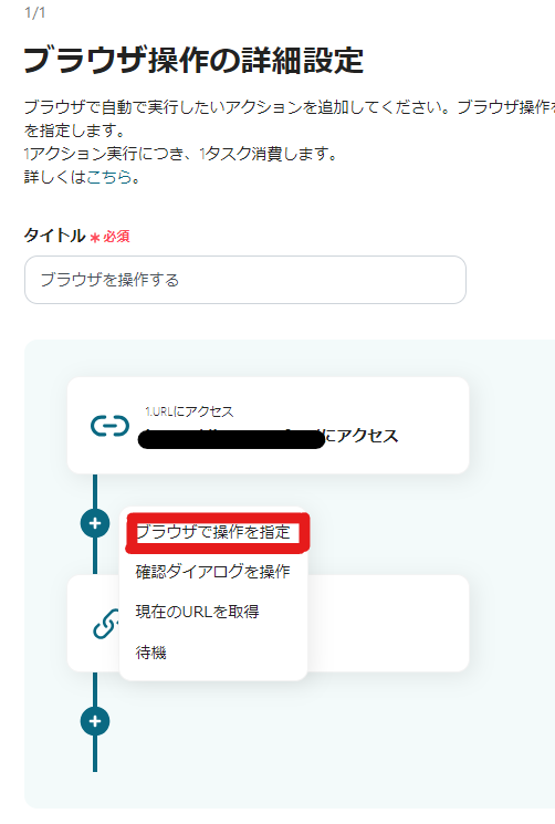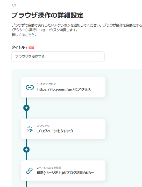 まずは、情報を取得したいURLを入力して「+」をクリック後、「ブラウザで操作を指定」をクリックして同じURLを入力します。