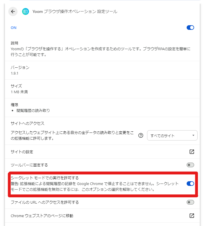 その際、シークレットウィンドウでの使用を許可することを忘れないようにしてください!