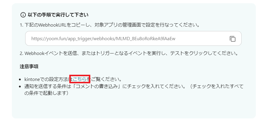 kintoneのWebhook設定はコピペするだけなのですぐに終わります!画像の赤枠のリンクからも確認可能です。