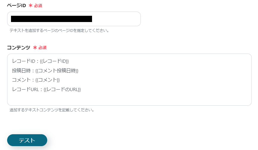 あとは、ページIDを入力して、Notionに記載したい内容をどんどん追加していきます。