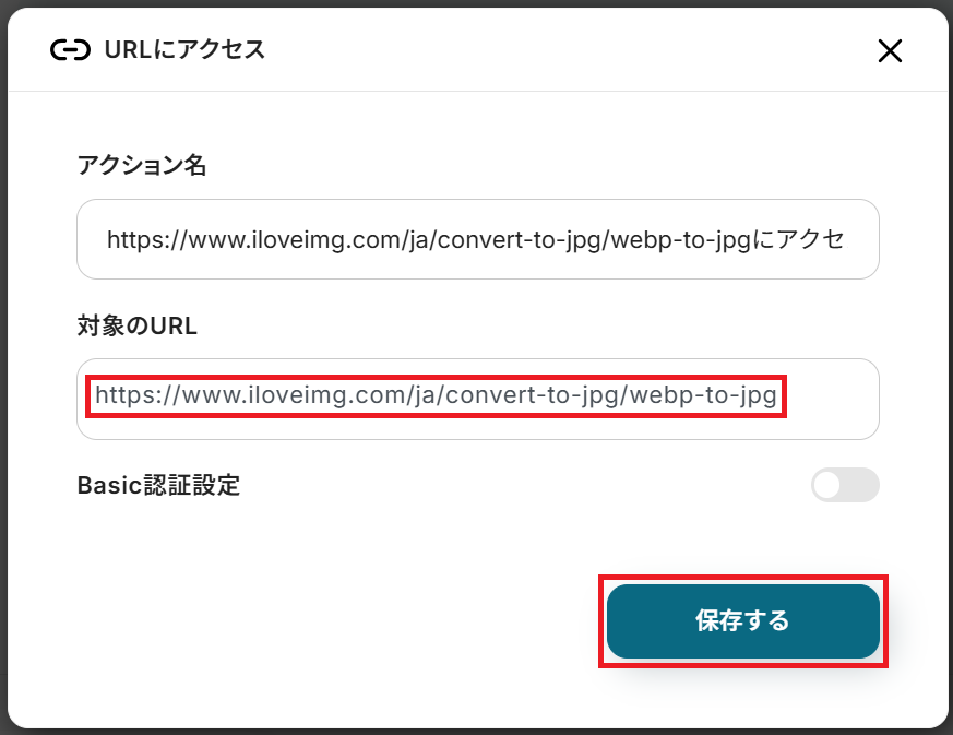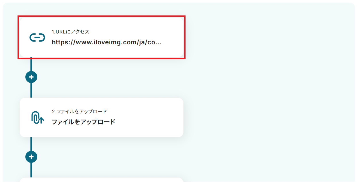 今回は操作例としてiLoveIMGを使用していますが、用途や社内ルールなどに応じてURLをカスタマイズして使いましょう。 「1.URLにアクセス」をクリックし、任意のアクション名と対象のURLを入力して保存することでカスタマイズできます。
