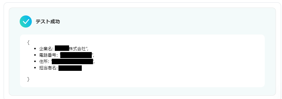 テストが成功すると、指定したGoogleスプレッドシートの項目が取得した値として反映されます。この値を次以降のステップで活用します。