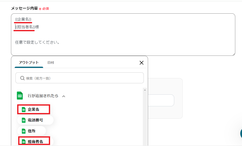 例えば、上記のように設定する場合、メッセージ内容の枠内をクリックし「行が追加されたら」の中にある「企業名」と「担当者名」をクリックしてください。