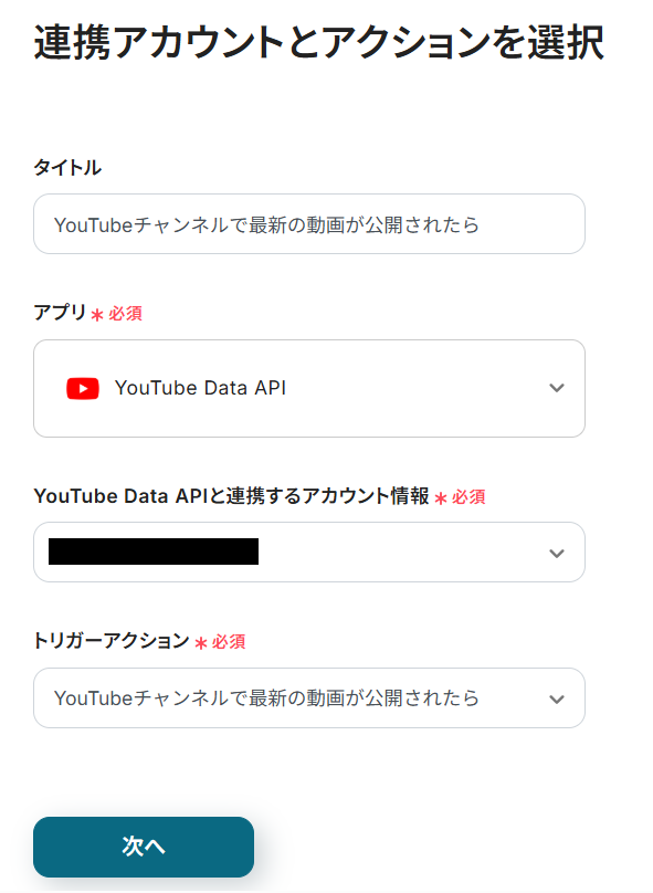 ※補足)上記画像のように設定すると、YouTubeで新たに動画が公開されたら「タイトル」と「動画ID」を自動で引用することができます。
