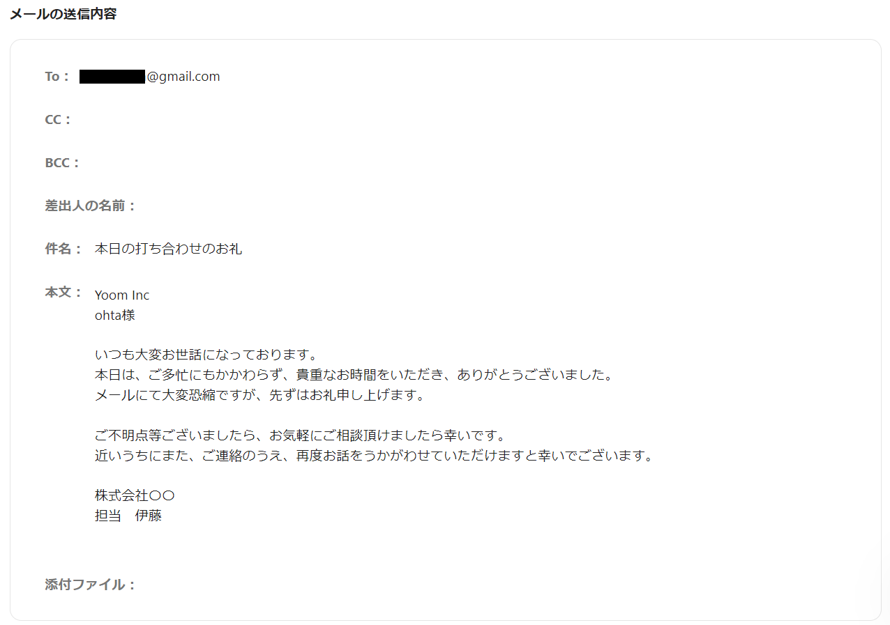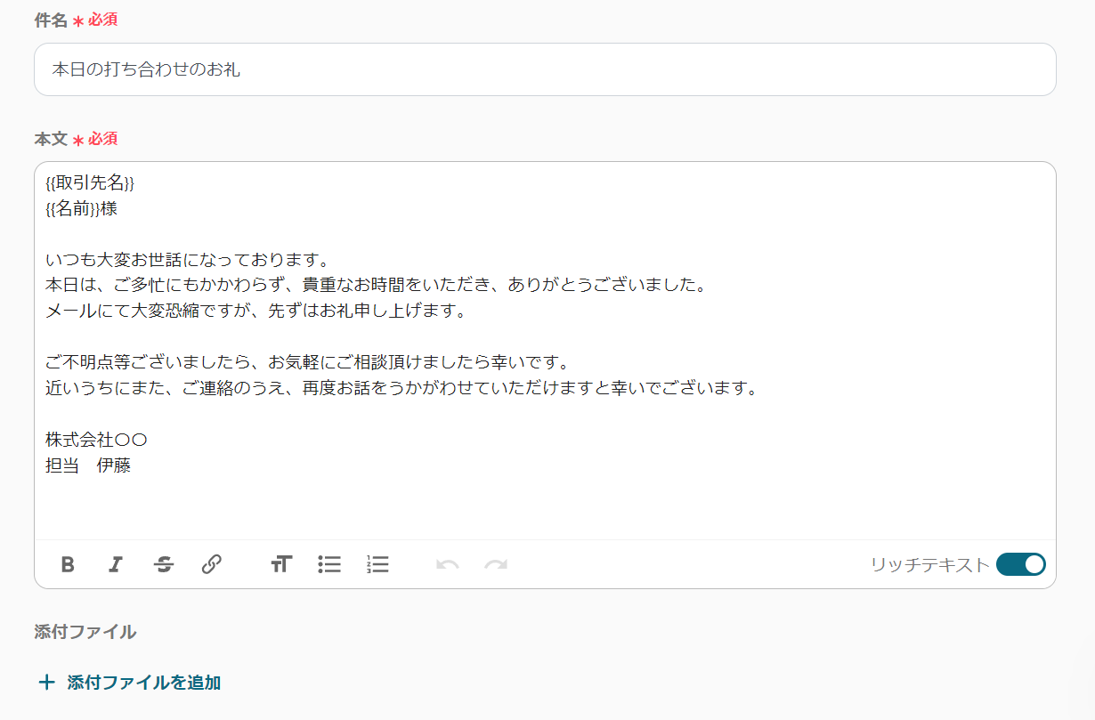 {{取引先名}}と{{名前}}と入力されているものは、コンタクト情報に依存して自動変換されるため、そのままにしておきましょう。