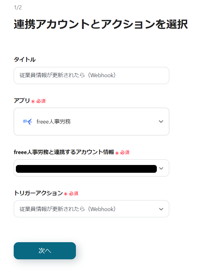 freee人事労務のアカウントは1つ前の手順で確認していますので、最初のページはそのままで「次へ」をクリックしてください。