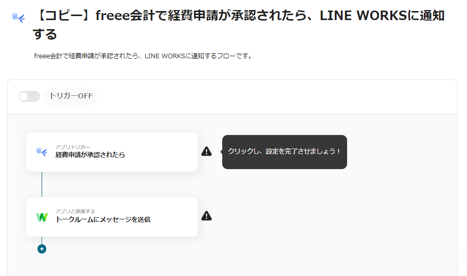 ここからは、「freee会計で経費申請が承認されたら、LINE WORKSに通知する」フローの設定についてご紹介します。