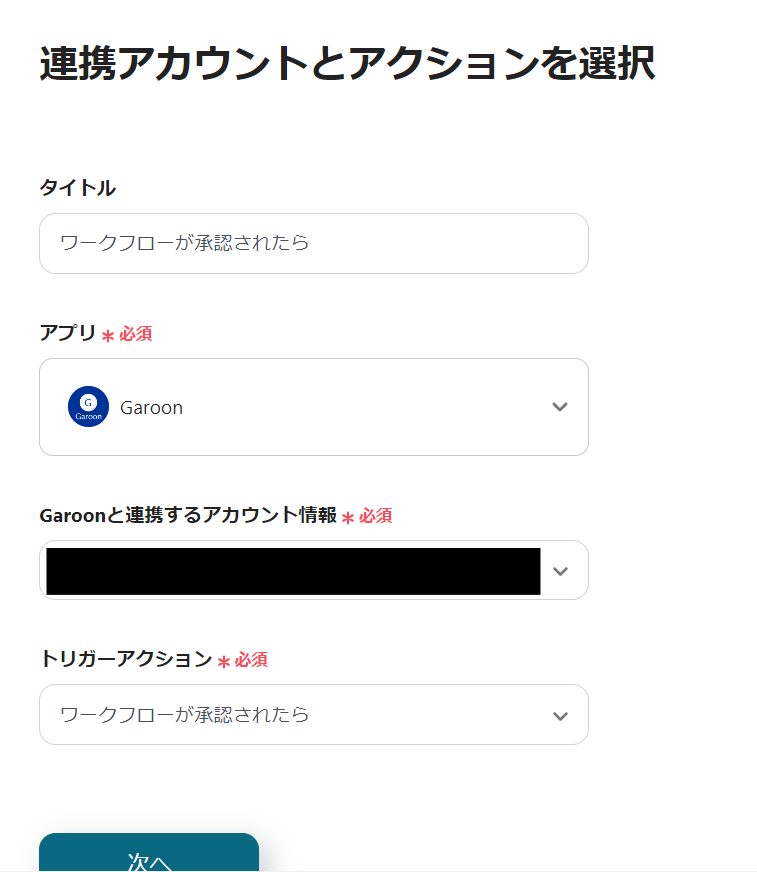 4) アクションは「ワークフローが承認されたら」を選択して、「次へ」をクリックします。