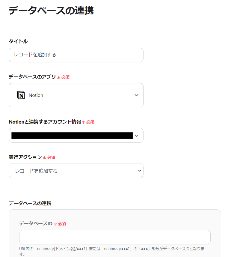 7) アクションは「レコードを追加する」を選択し、「データベースの連携」を入力します。