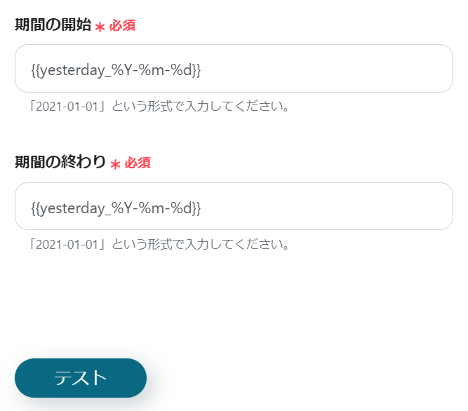 必須項目の入力ができたらテストボタンをクリックしてください。