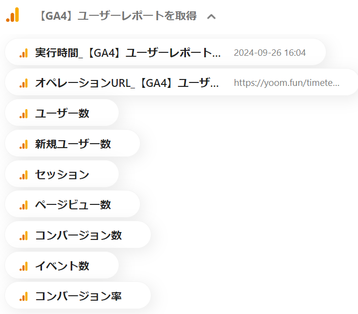 1.Google アナリティクスのアイコンの「【GA4】ユーザーレポートを取得」を開く タイトルやトリガーアクションの設定は完了しているため、次へ進みましょう。