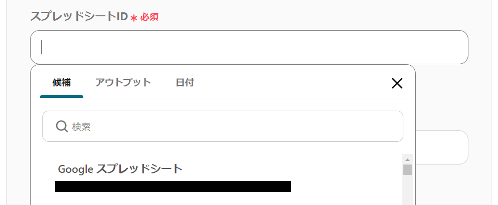 ボックスの中をクリックすることで連携済みのGoogle スプレッドシートが一覧表示されます。
