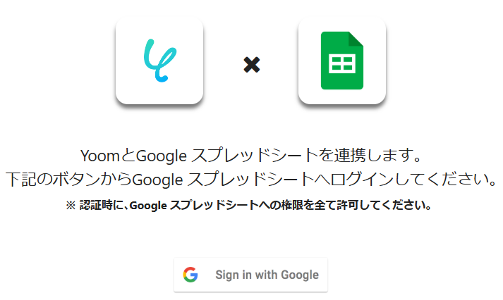 ・マイアプリ→新規接続→Google スプレッドシートの順で進み、「Sing in with Google」をクリックします。