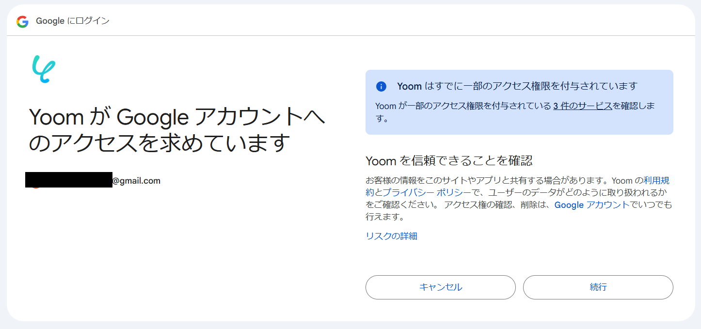 ・YoomがGoogleアカウントへの追加アクセス許可の画面で「続行」を選択しましょう。