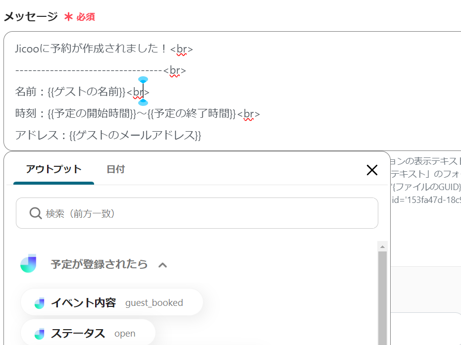 ボックス内をクリックすると、先ほど作成したJicooの予約の詳細が一覧表示されます!Microsoft Teamsに通知したい内容をクリックすればOKです。