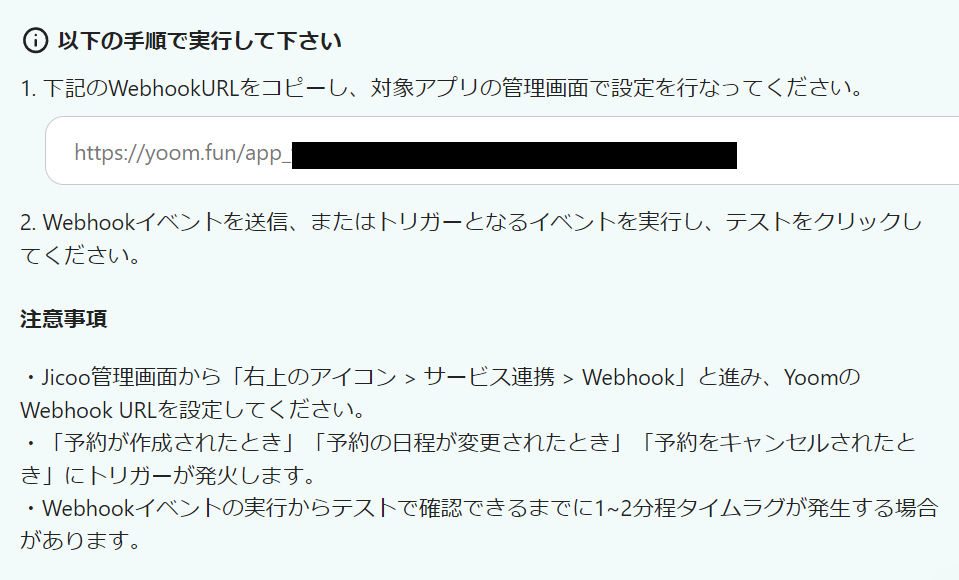 WebhookURLをコピーして、先ほどのマイアプリ登録と同じ流れでJicooの設定画面を開きましょう。