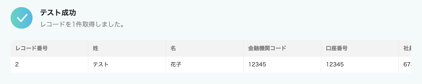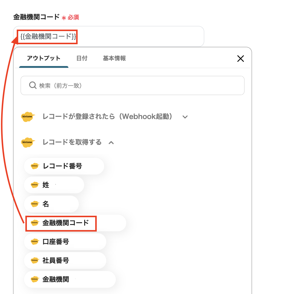 「利用者番号」「金融機関コード」「金融機関支店コード」「口座番号」「口座名義」など、従業員ごとに異なる情報について、kintoneのレコードから取得したアウトプットを引用して設定することで、従業員ごとに合わせた内容でユーザー登録を行うことができます。