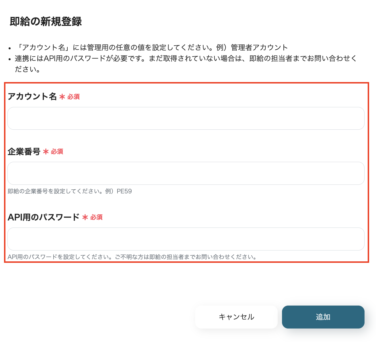 即給の新規登録画面が表示されるので、各項目の注釈を参照して赤枠内の設定を行い、「追加」をクリックしてください。