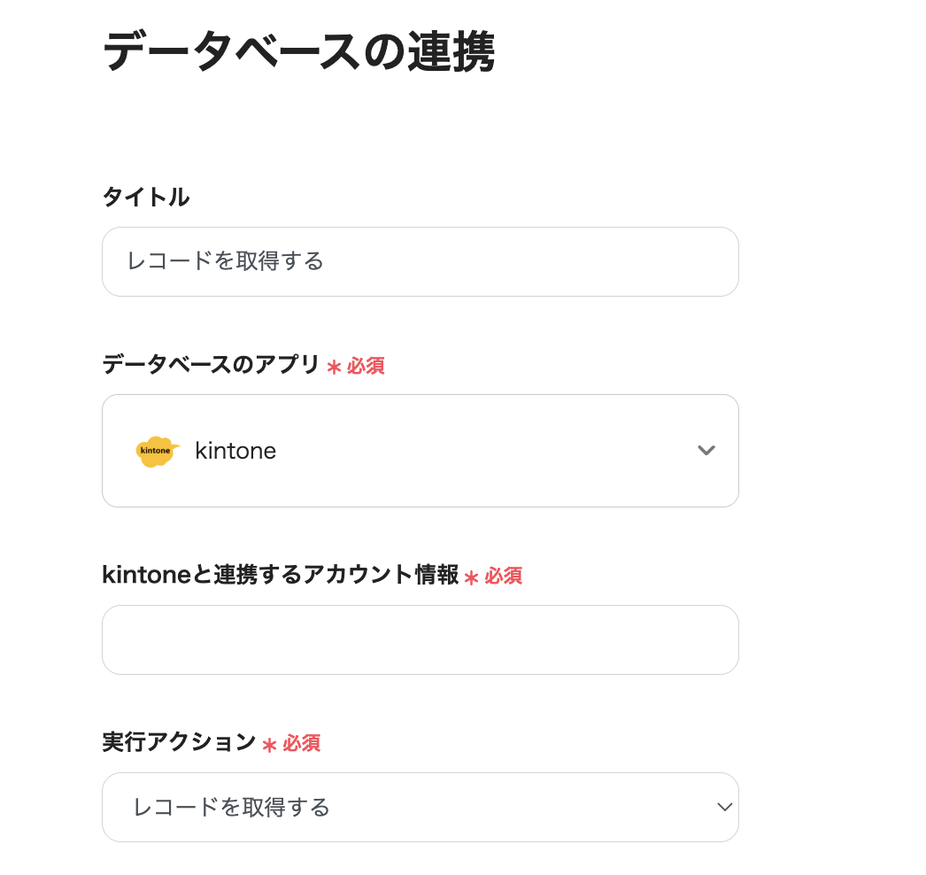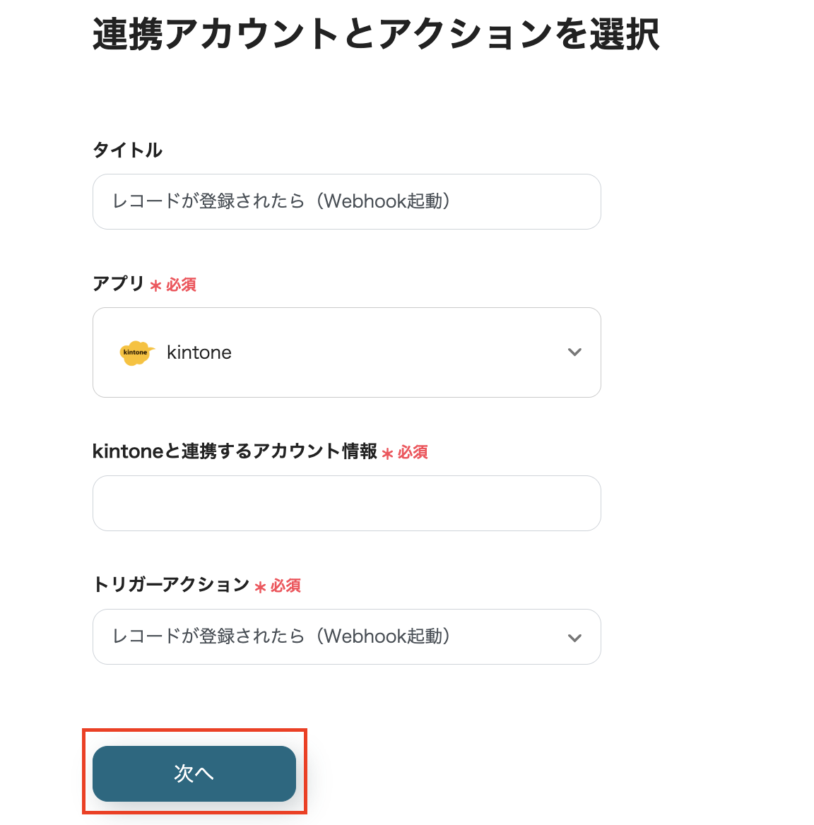 ・アクション:「レコードが登録されたら(Webhook起動)」が選択されていることを確認します