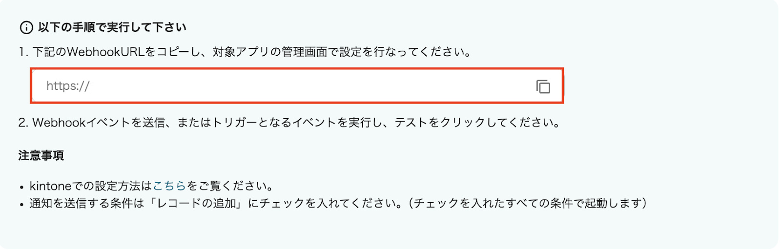 下図の赤枠内に表示されているURLをコピーして、kintone管理画面で設定を行ってください。