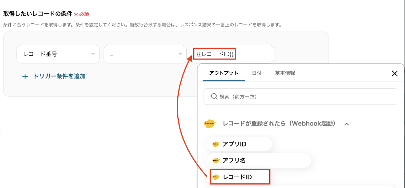 まず、「レコード番号=レコードID」となるよう、先ほどkintoneのアプリトリガー設定で取得したアウトプットを引用して設定します。