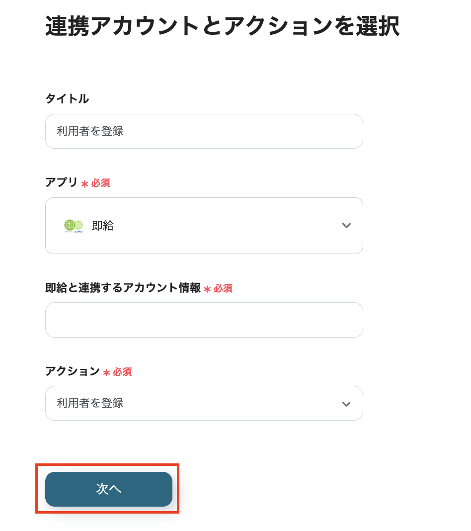 連携アカウントとアクションの設定画面が表示されるので、以下のように設定を行い、「次へ」をクリックします。
