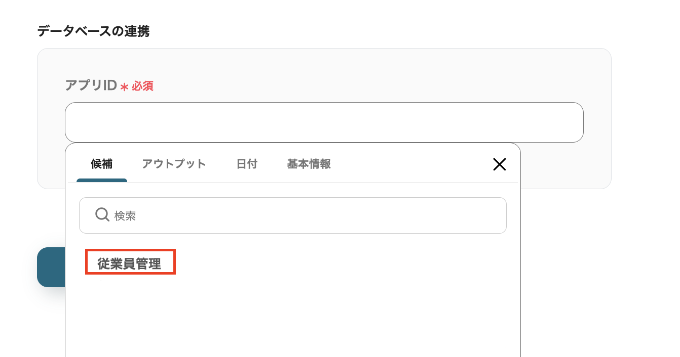 「データベース連携」欄をクリックすると、連携しているアカウントから候補が表示されるので、候補から選択するか、指定したいデータベースのアプリIDを手入力してください。