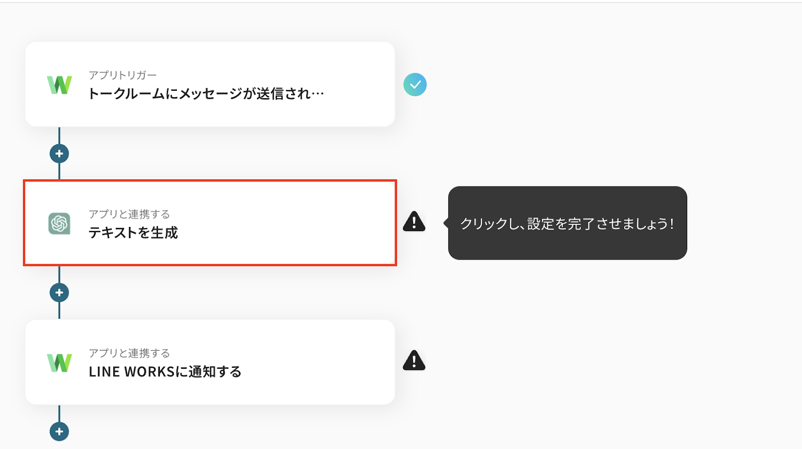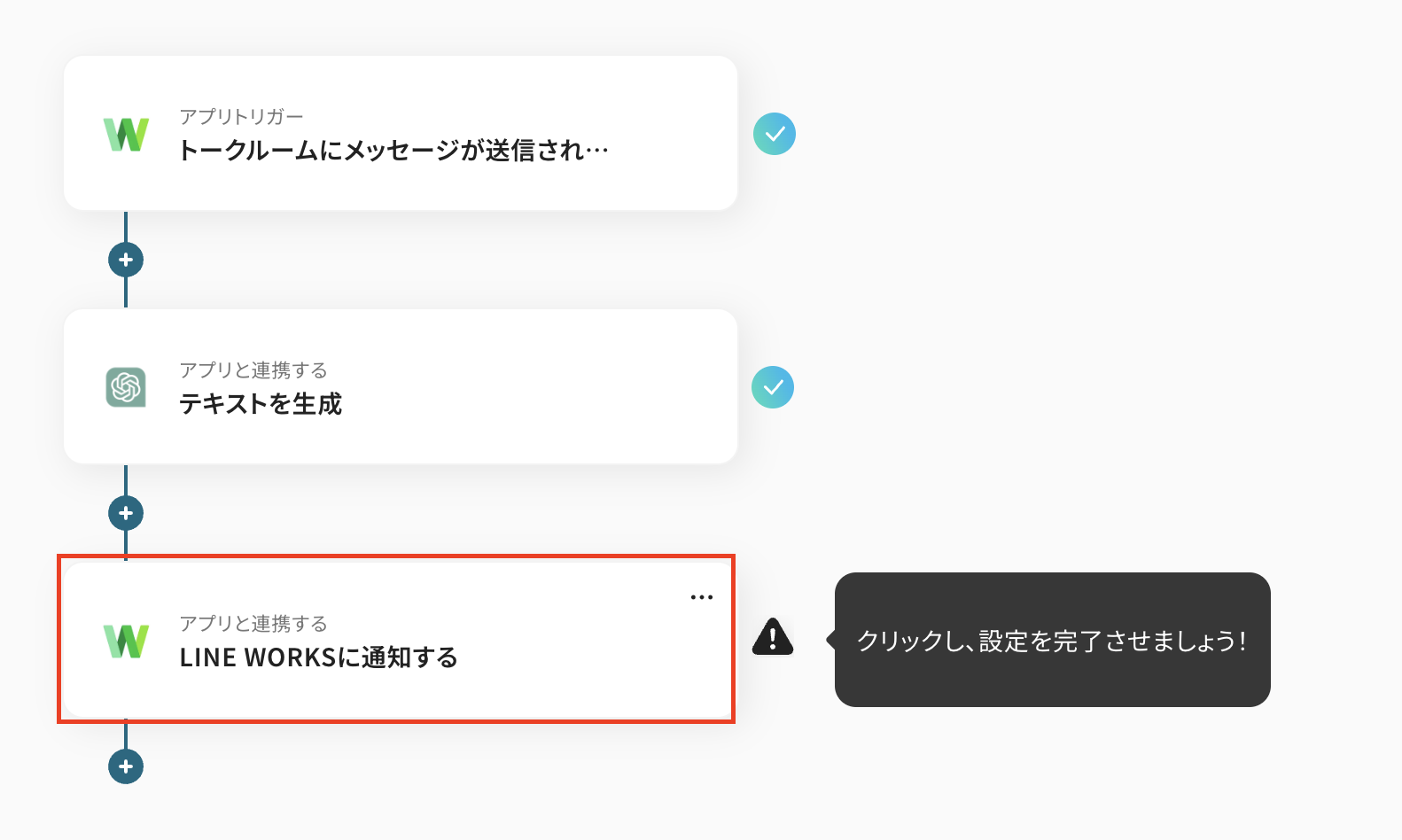 分岐機能の設定では、特定のキーワードを含むメッセージのみを処理対象とするなど、任意の条件を指定してください。 ChatGPTでテキストを生成するアクションでは、返答文案のトーンや内容を調整するため、送信するメッセージ内容やChatGPTへの指示(ロール)を任意でカスタマイズしてください。 LINE WORKSでトークルームにメッセージを送信するアクションでは、通知先のボットID、送信するメッセージ内容、および通知先のトークルームIDを任意でカスタマイズしてください。 ■注意事項