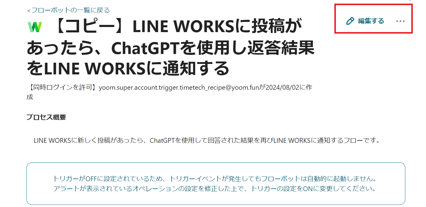タイトルはフローの内容がわかりやすいように記入してありますが、詳細含め、変更が可能です。 変更したい場合は右上の「編集する」をクリックし、使用しやすいように変更してください。