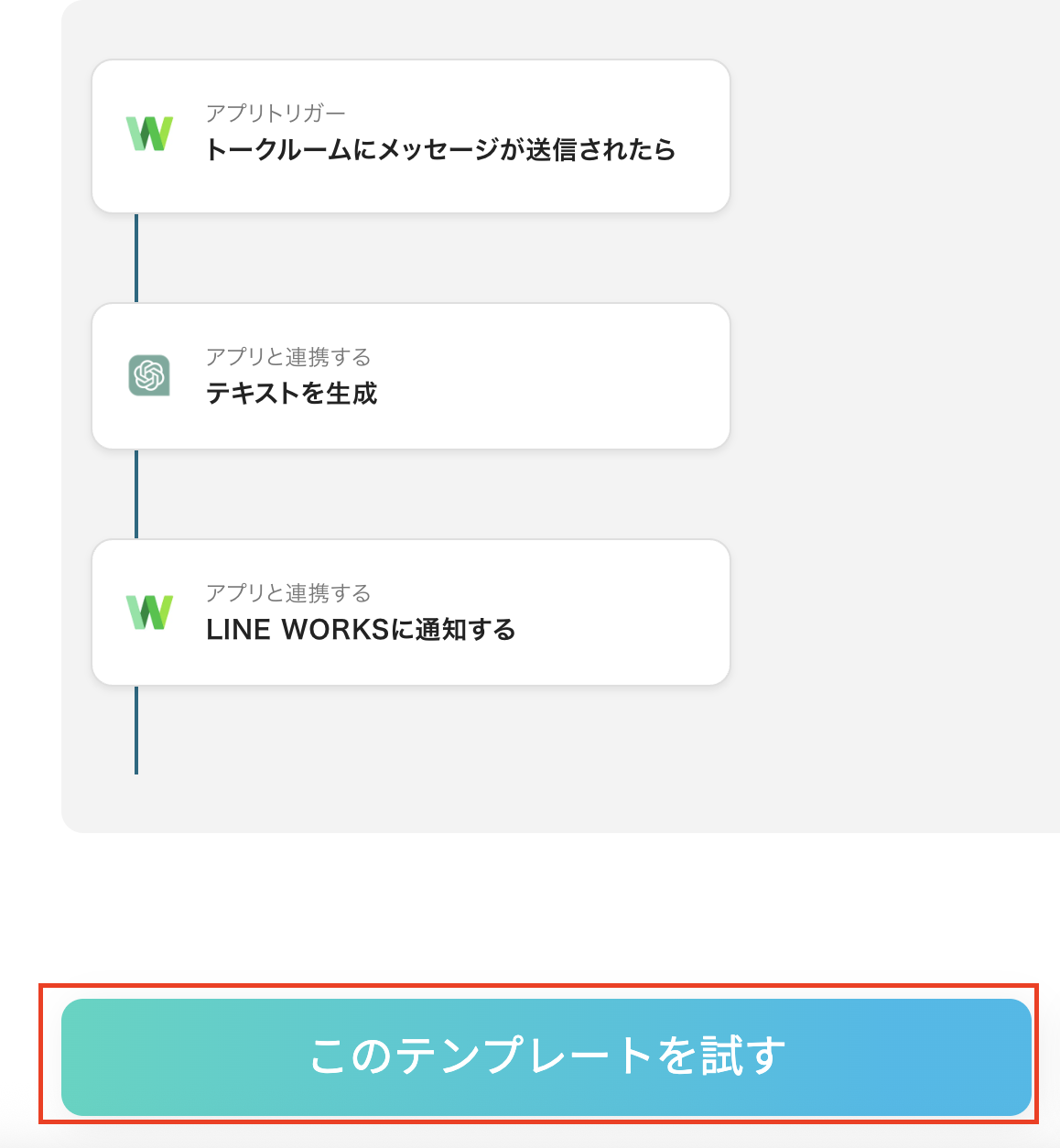 LINE WORKSでの定型的な問い合わせ対応を効率化したいと考えている方 ChatGPTを活用し、メッセージ返信業務の自動化に関心のある方 手作業によるメッセージ作成や通知の手間を削減したいチームや担当者の方 ■このテンプレートを使うメリット