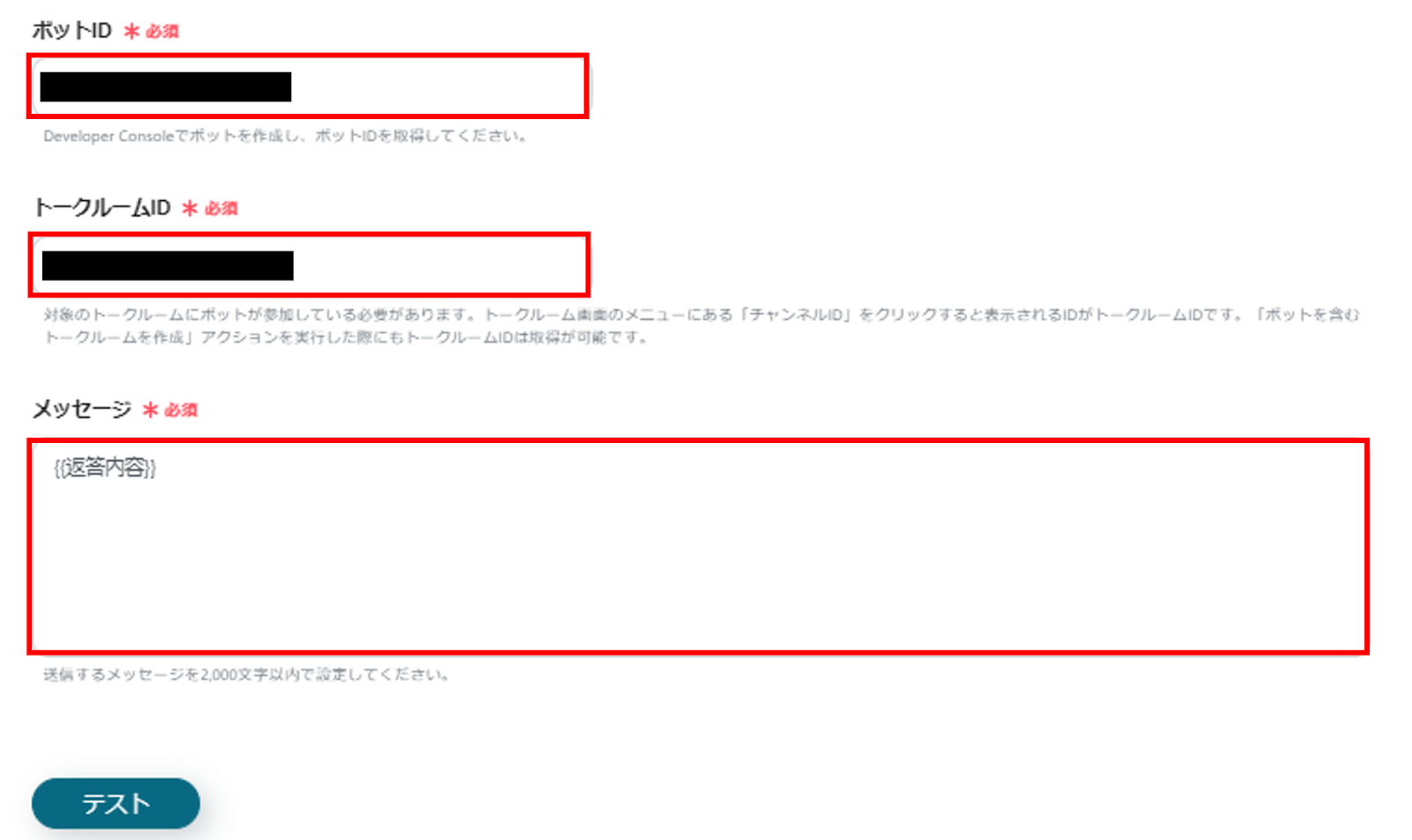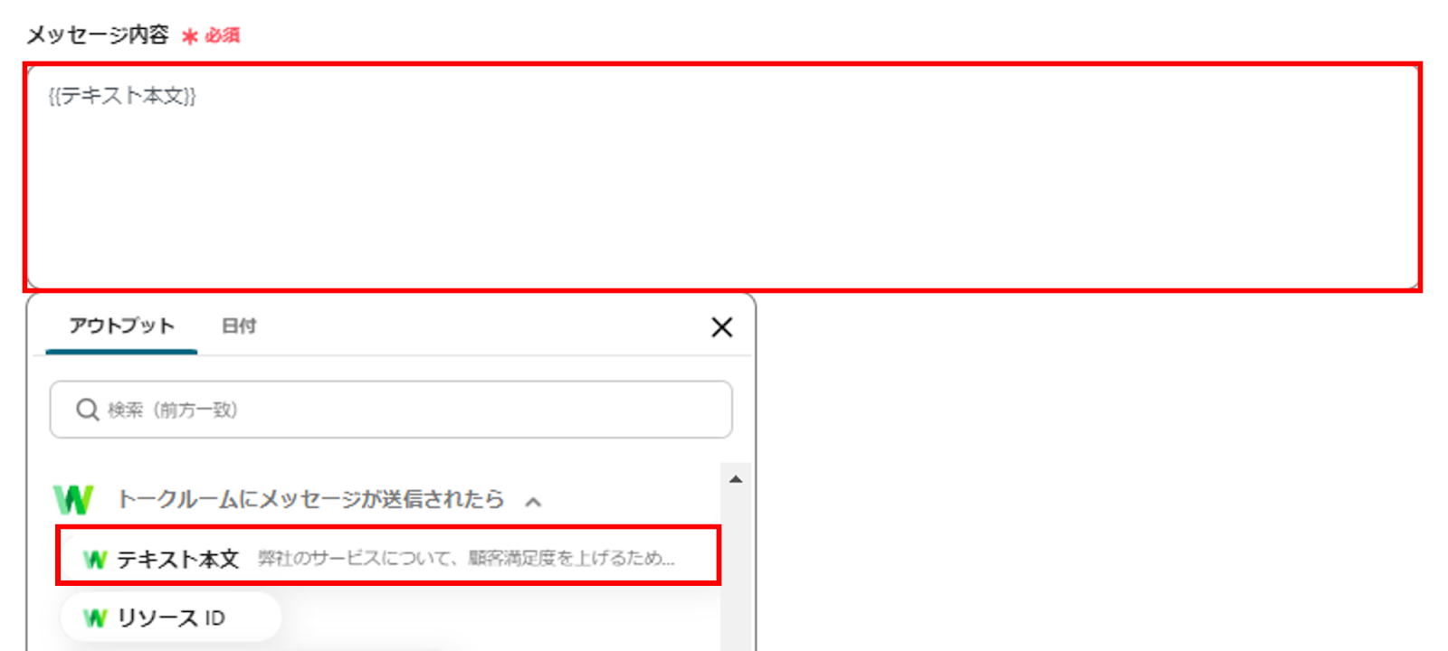 メッセージ:アウトプット(取得した値)を活用しつつ、その他に固定で通知させたいメッセージがあれば入力してください。