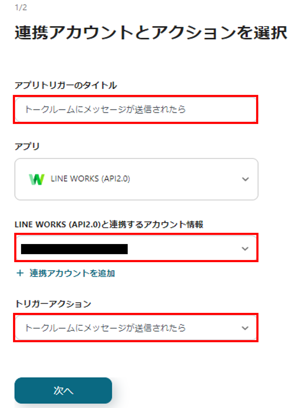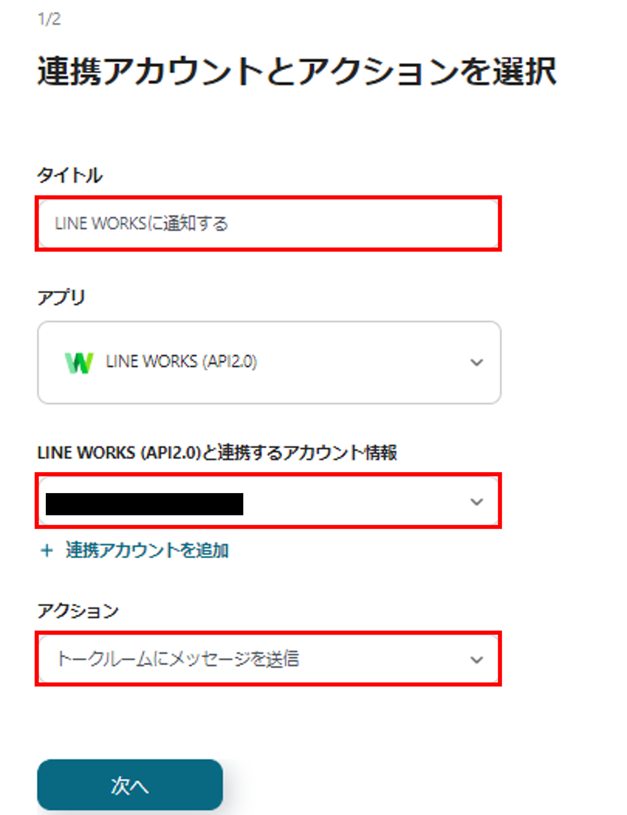 (2)こちらの画面は設定されていますが、タイトルは変更できます。 LINE WORKSと連携するアカウント情報とアクション(トークルームにメッセージを送信)が選択されていることを確認し、次へをクリックしましょう。