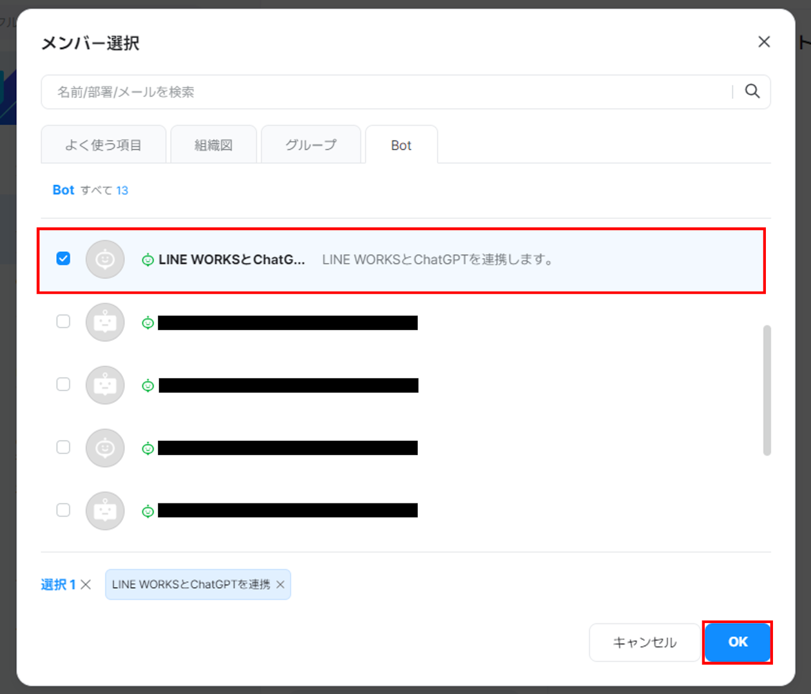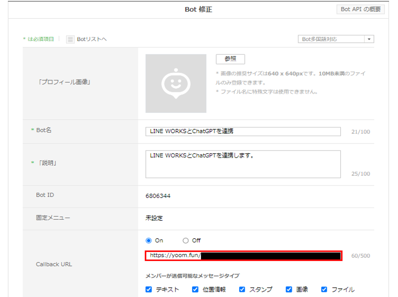 Botの追加については、LINE WORKS公式のDeveloper ConsoleにBotを追加する を参考に設定してください。 (6)作成したBotを招待したトークルームを作成します。
