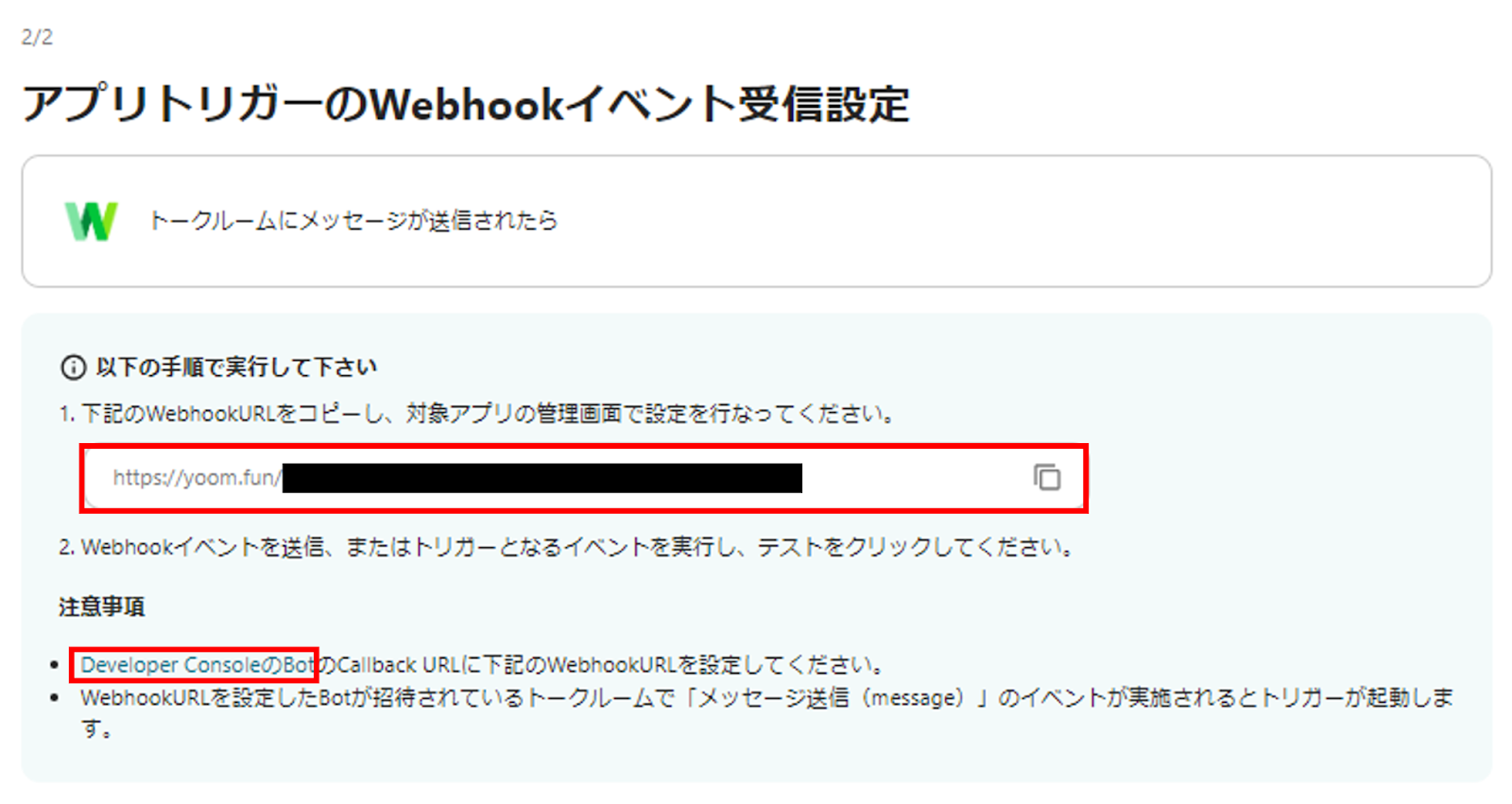 ■アプリトリガーのWebhookイベント受信設定 (3)WebhookURLをコピーした状態で、Developer ConsoleのBot のリンクをクリックします。