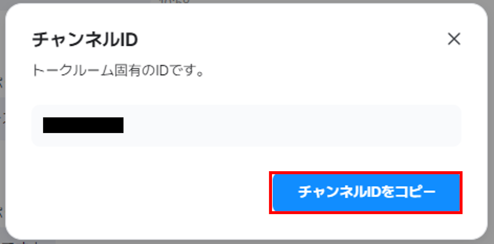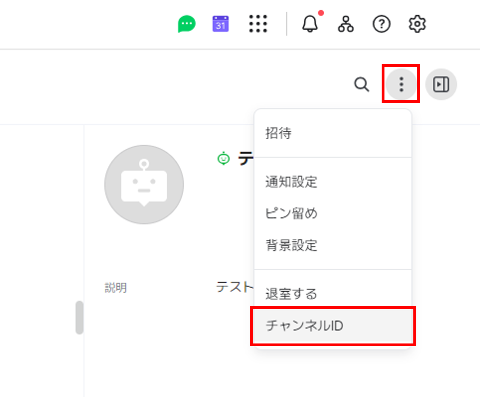 ■API接続設定 設定の前に、対象のトークルームの「チャンネルID」を確認しておきましょう! ➀LINE WORKSで、通知設定したいチャンネルの縦三点リーダーからチャンネルIDをクリック