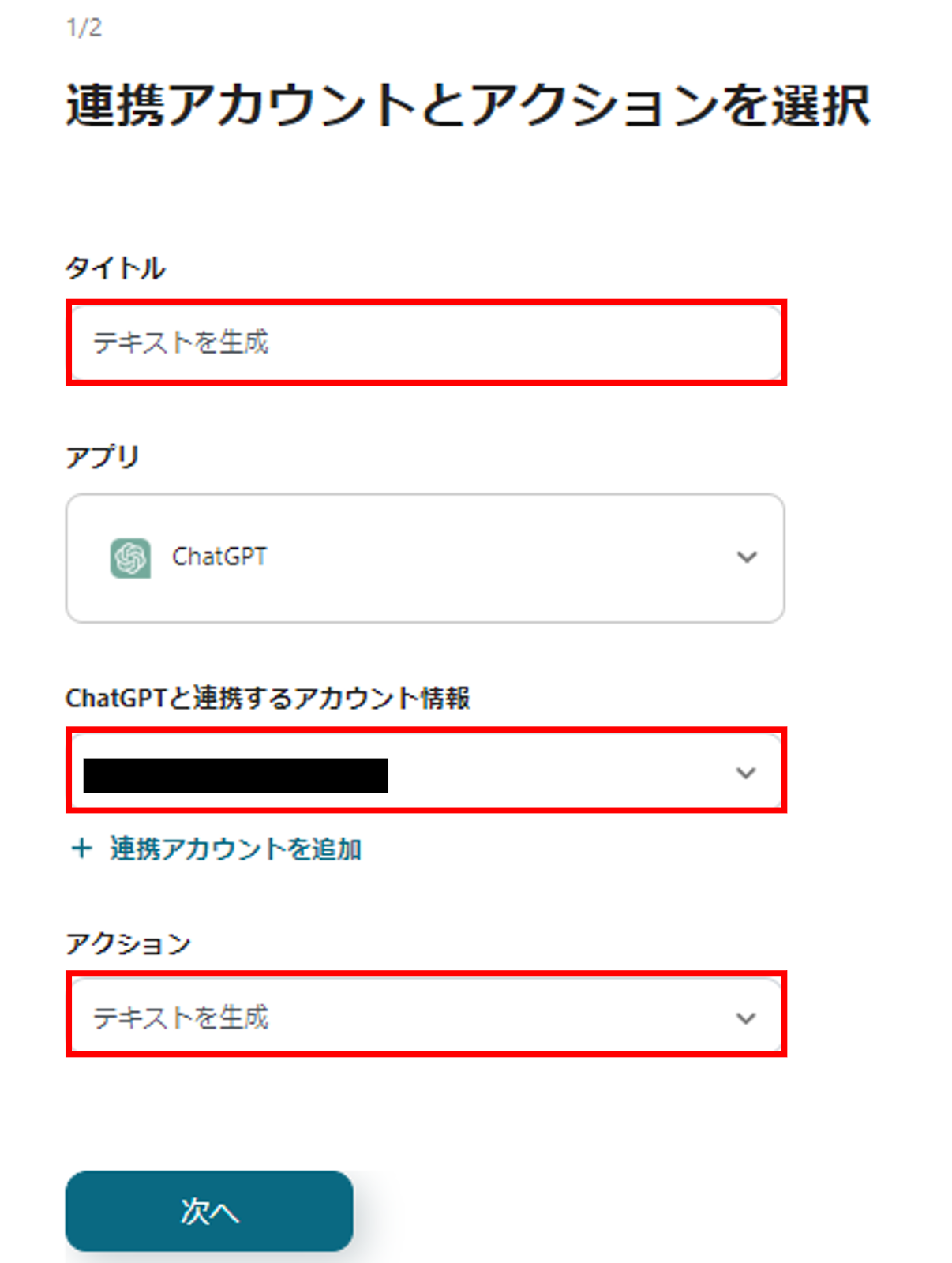 (2)こちらの画面は設定できていますが、タイトルを変更したい場合は入力してください。 ChatGPTと連携するアカウント情報とアクション(テキストを生成)を確認しましょう。 設定できたら、次へをクリックしてください。