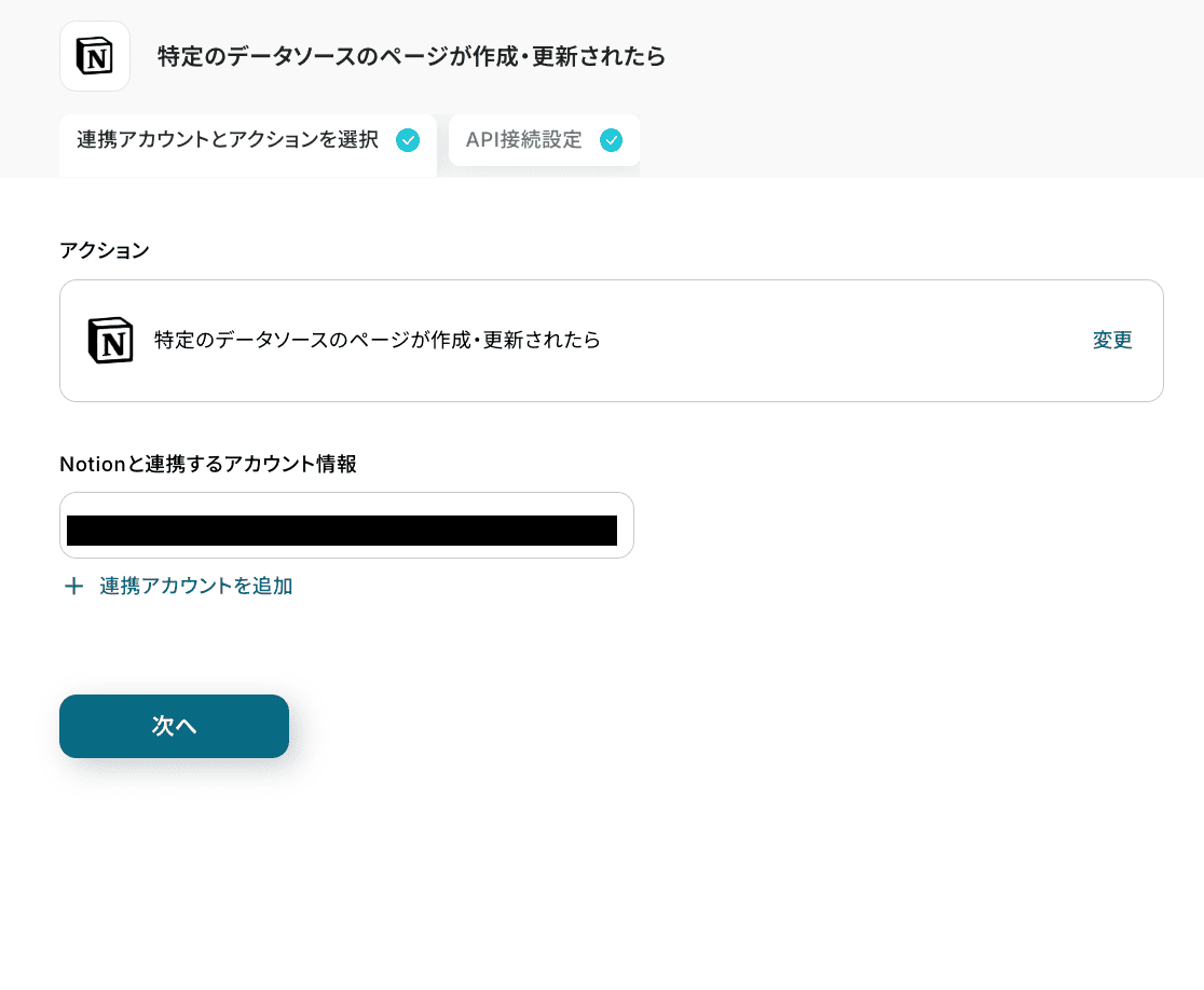 ステップ2:Notionでアプリトリガー設定 最初の設定は「特定のデータソースのページが作成・更新されたら」です。