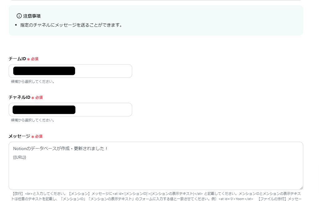 チームID、チャネルIDを指定した後に「取得した値」を活用してメッセージを作成してみましょう。 「取得した値」を活用せずに手入力をしてしまうと、毎回同じメッセージ内容が通知されてしまいます。 手入力部分は「固定値」で取得した値を埋め込んだ部分は取得した情報に応じて内容が変化する「変数」だと覚えておきましょう! ※入力欄をクリックすると「取得した値」が表示されるので、入力したい項目を選んでください。