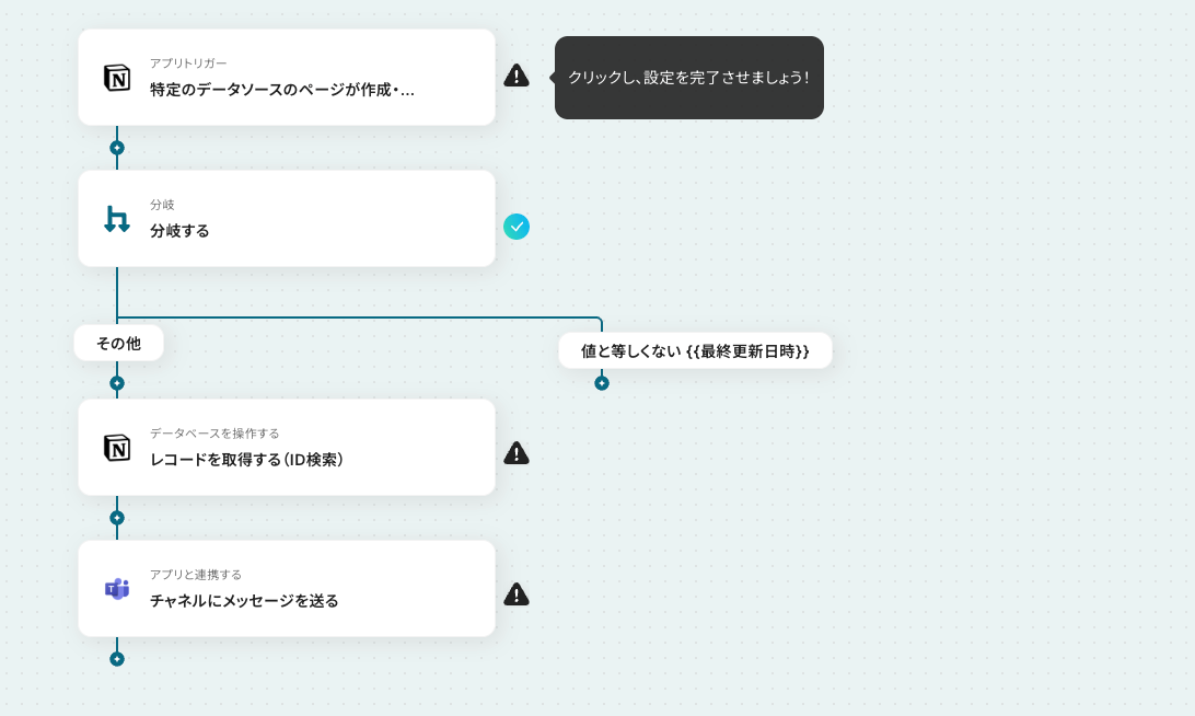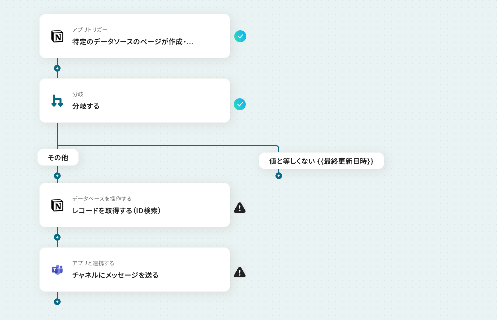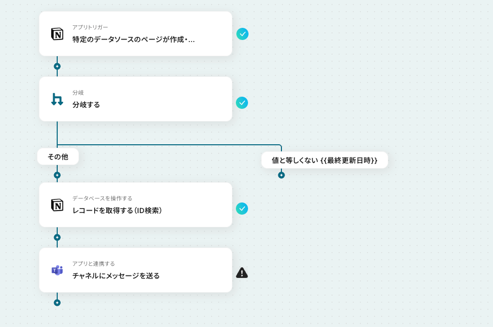 はじめに、NotionとMicrosoft TeamsをYoomと連携します 次に、トリガーでNotionを選択し、「特定のデータソースのページが作成・更新されたら」を設定します オペレーションの分岐機能を設定し、新規ページの場合のみ後続のアクションが実行されるようにします 続いて、オペレーションでNotionの「レコードを取得する(ID検索)」を選択し、作成されたページの詳細情報を取得します 最後に、オペレーションでMicrosoft Teamsの「チャネルにメッセージを送る」を設定し、取得した情報を指定のチャネルに通知します ※「トリガー」:フロー起動のきっかけとなるアクション、「オペレーション」:トリガー起動後、フロー内で処理を行うアクション■このワークフローのカスタムポイント