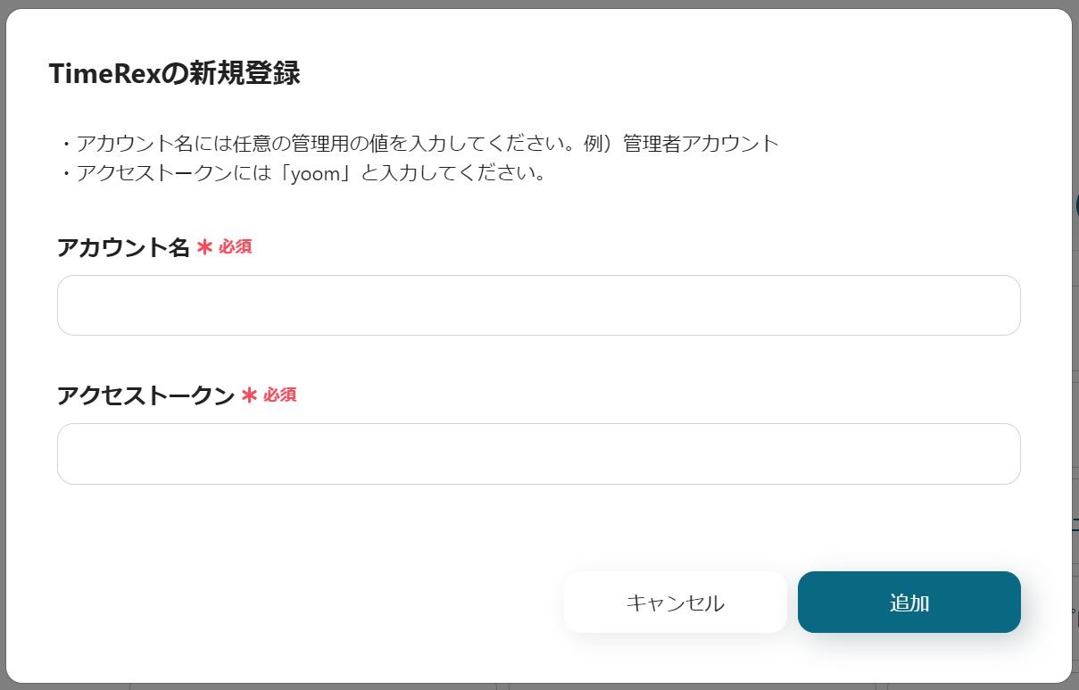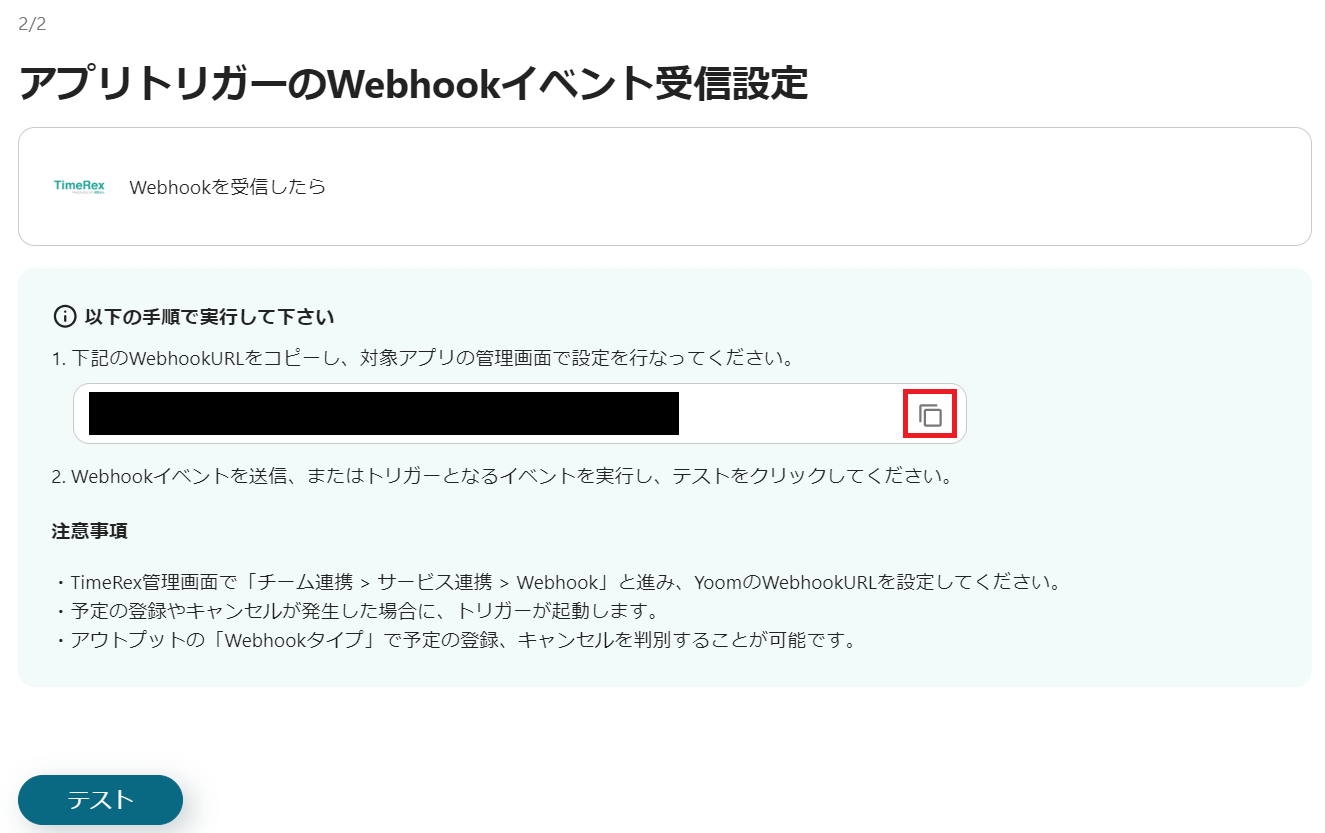 TimeRexの管理画面を開いて、「チーム連携>サービス連携>Webhook」と進み、YoomのWebhookURLを設定してください。
