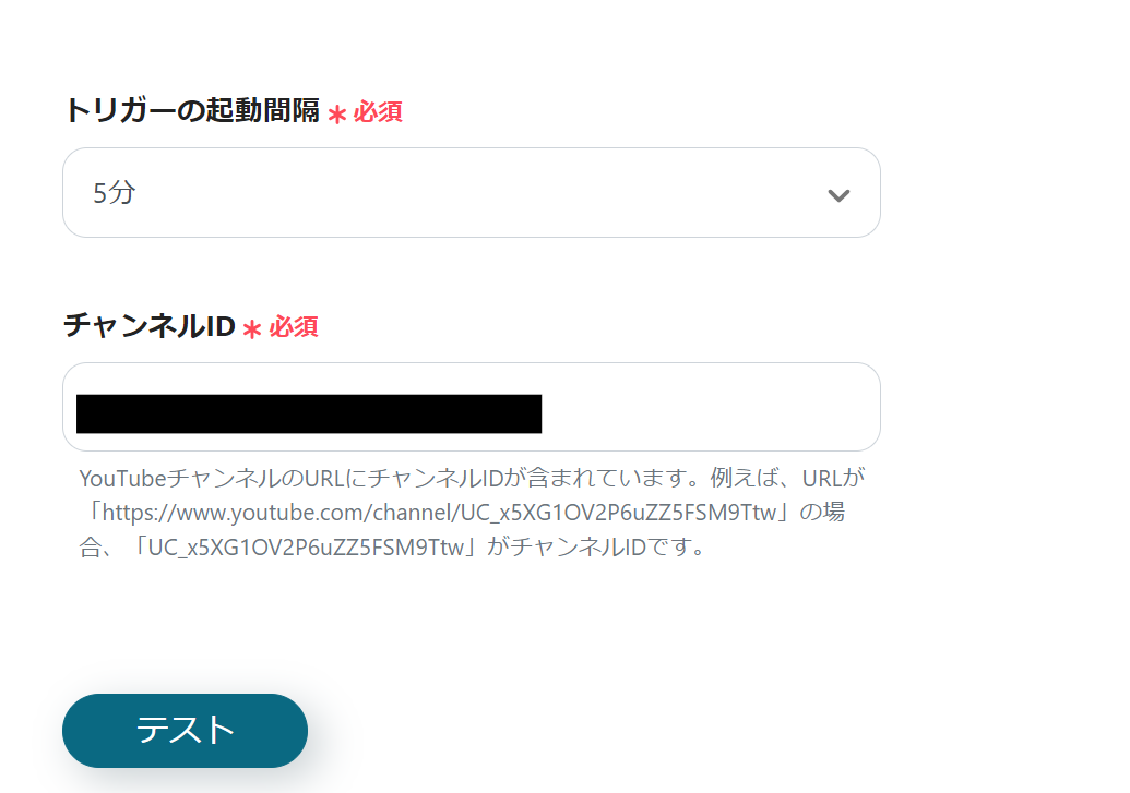 5)トリガーの起動間隔を選択し、チャンネルIDを入力したら、「テスト」をクリック、テストが成功したら「保存」します。