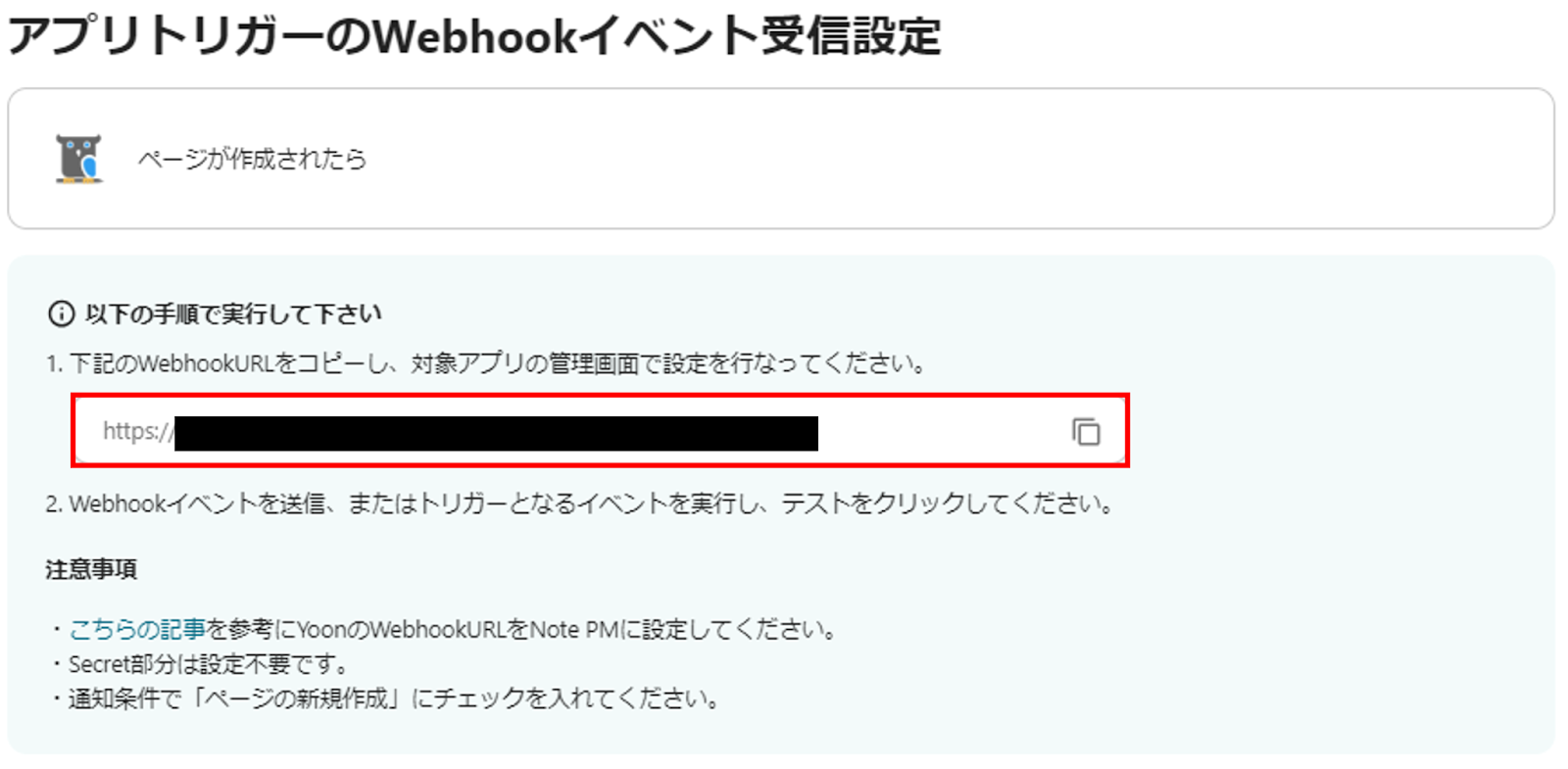(5)画面の指示にしたがってWebhookURLをコピーし、下記の設定を行ってください。