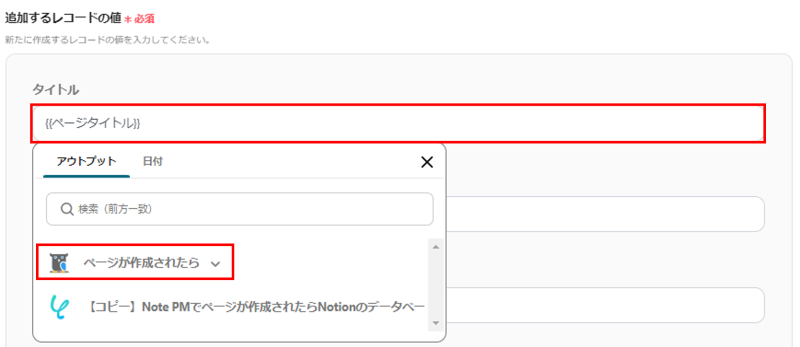 (11)追加するレコードの値には、「ページが作成されたら」のアウトプットからNo任意で設定