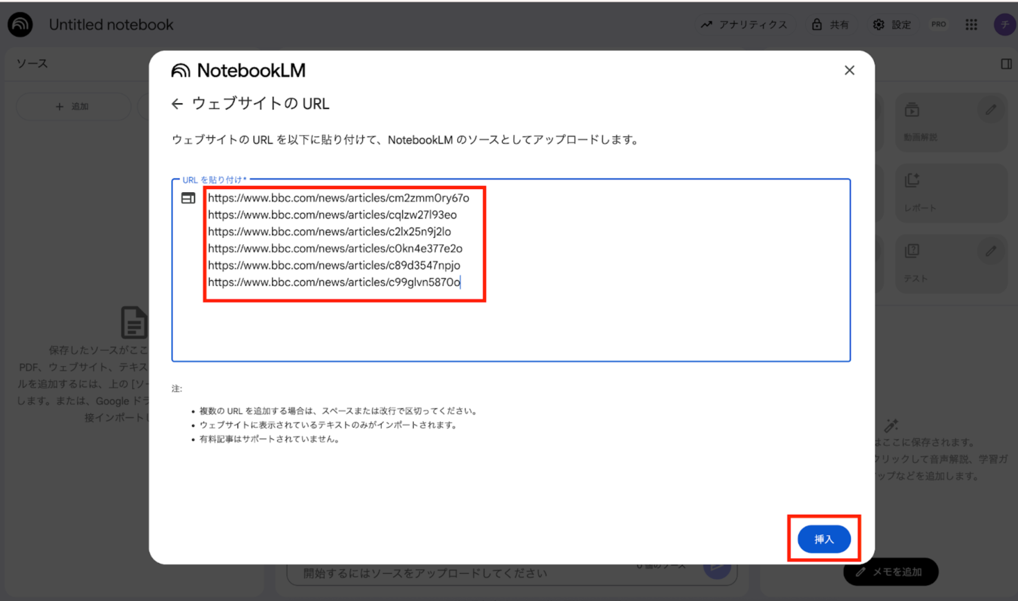 ソース追加画面。ウェブサイト、Googleドライブ、YouTubeなどが選択可能 私はBBCのニュースリンクを試しに6記事ほど入れてみました。一気に追加できるのはありがたいです。